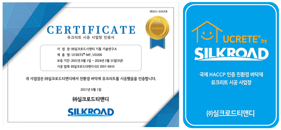 업체에 유크리트 시공 사업장임을 증명하는 'UCRETE(유크리트) 바닥재 인증 제도' 서비스를