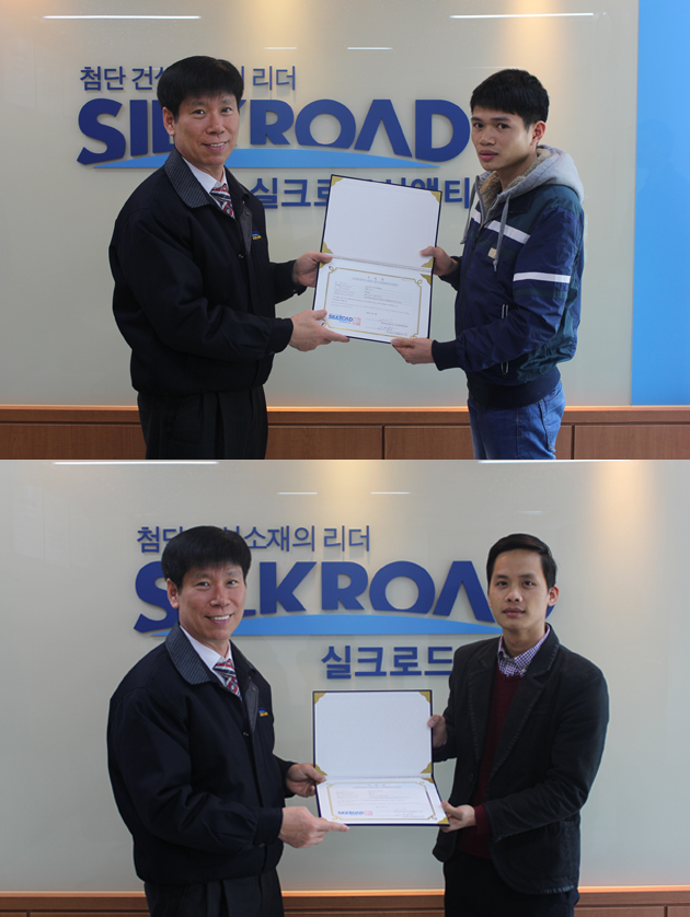 이날 수료한 베트남 연수생 NGUYEN HUU TRINH과 TRINH VAN THINH 두 사람은 2014년 10월 13일부터 2015년 1월 9일까지 약 3개월여에 걸쳐 실크로드시앤티 기술연구소에서 콘크리트 혼화제 전문가 교육과정을 이수했다.